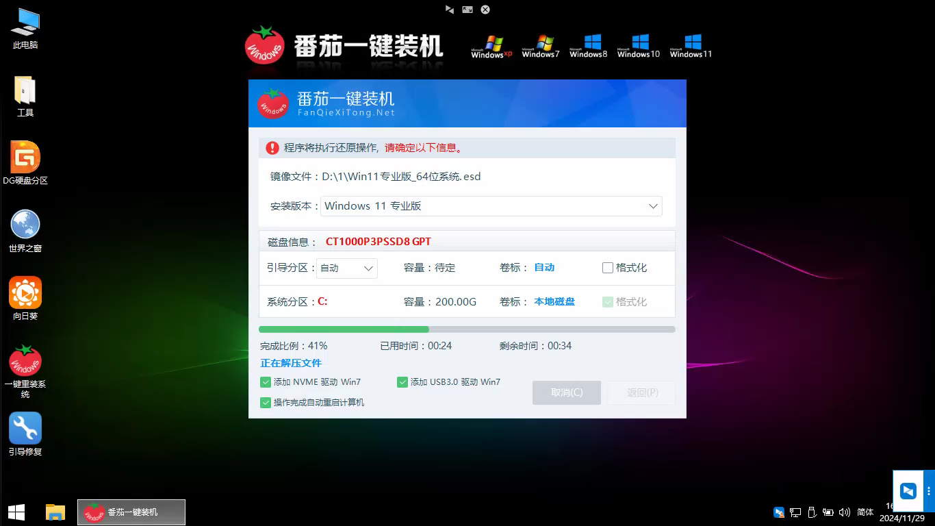 第三步、系统将自动重启进入PE界面,等待安装完成,自动重启系统进入欢迎界面后,安装成功。安装过程大概5~10分钟。